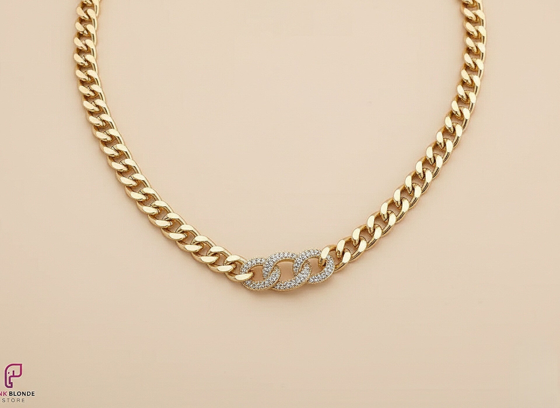 Make a powerful fashion statement with this stunning gold-plated chunky link necklace. Featuring three central links encrusted with shimmering pavé crystals, this piece combines industrial edge with high-end glamour. It sits perfectly at 45 cm with a 5 cm extension for a bold, customizable look.