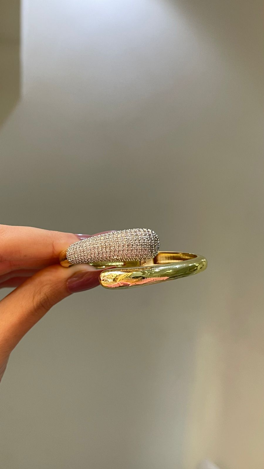 Elevate your wrist game with this stunning open-wrap bangle, featuring a sleek gold finish and a shimmering pavé crystal accent. Crafted from high-quality platinum, this durable piece offers a luxurious weight and a brilliant, high-end shine that lasts. Its unique teardrop silhouette provides a modern, sophisticated touch that transitions perfectly from day to night.
