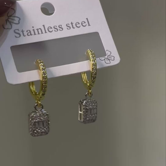 Elevate your style with these sophisticated hoop earrings, expertly plated in premium platinum for a high-end, mirror-like shine. Featuring a stunning rectangular baguette-cut crystal surrounded by a shimmering pave halo, these earrings offer a perfect blend of modern luxury and timeless grace.