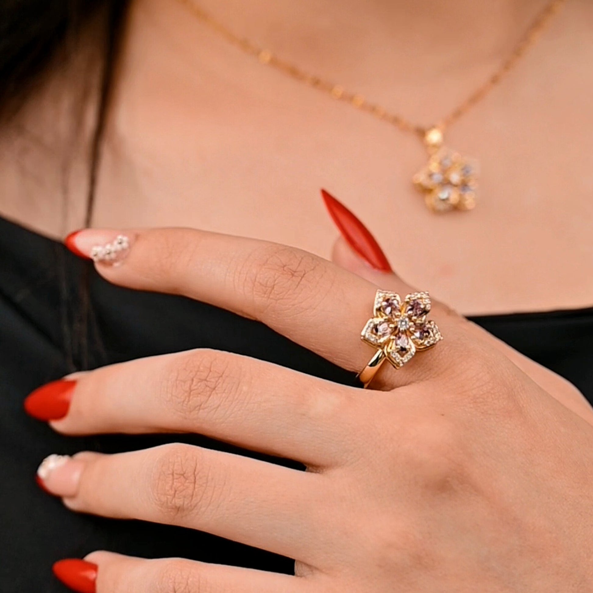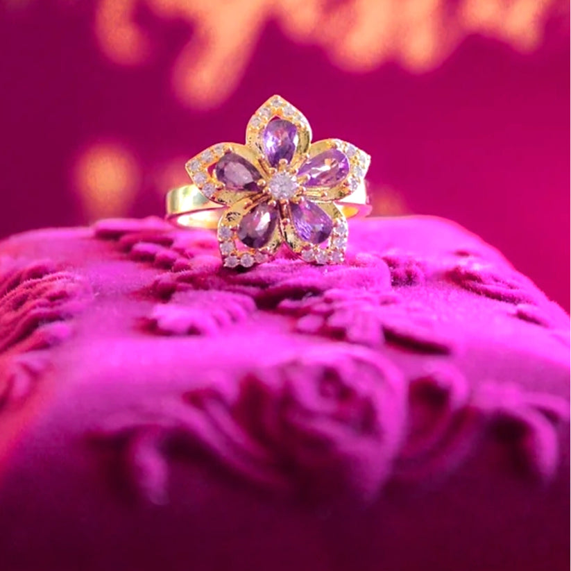 🌟 A Mesmerizing Touch – The spinning flower centerpiece, adorned with brilliant purple stones, gives this ring a unique and playful charm that catches the light—and everyone’s attention!