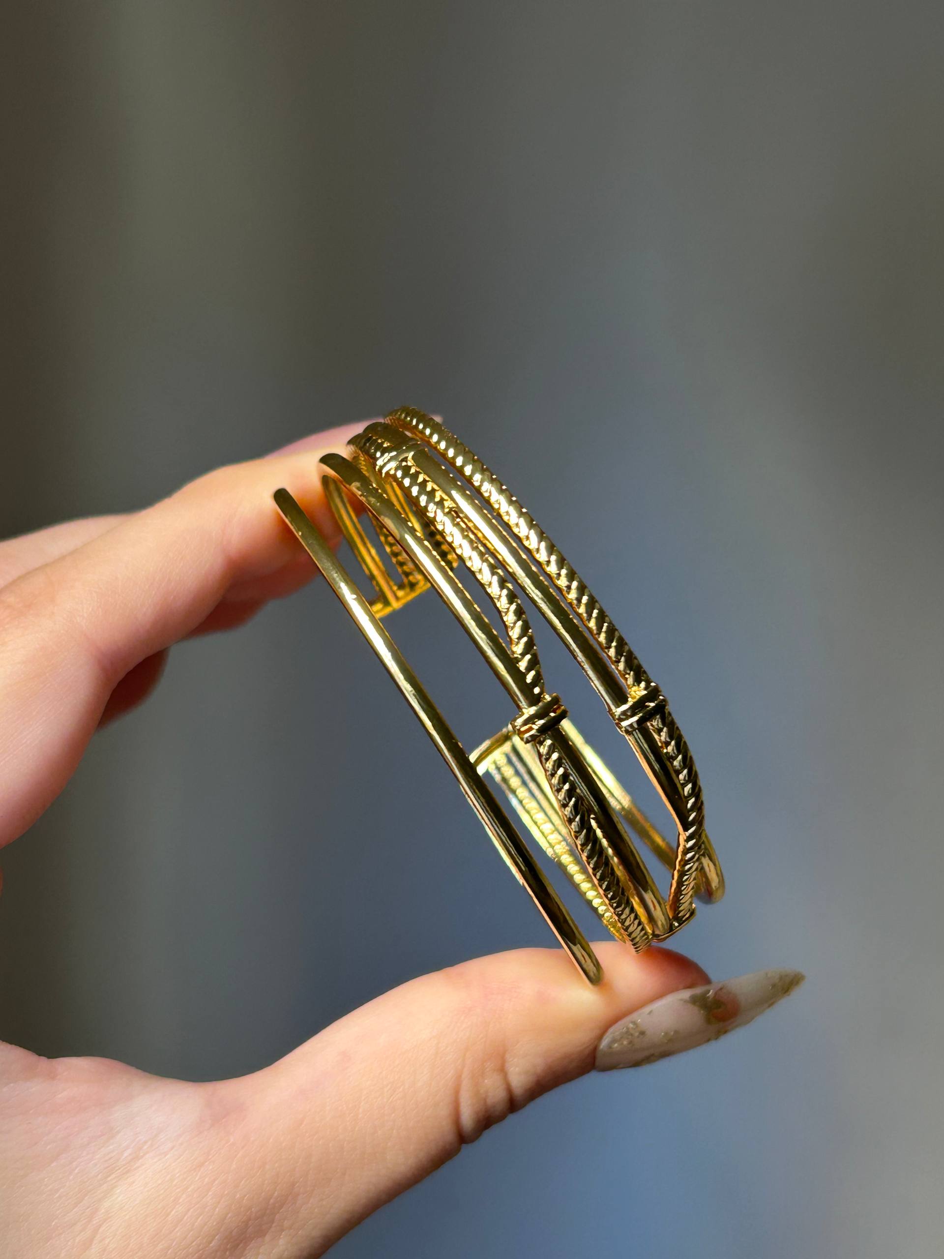 Discover the perfect balance of classic and modern with this multi-row cuff, showcasing a mix of polished and intricately twisted golden strands. The durable stainless steel construction guarantees a tarnish-free glow, while the open-cuff style allows for easy on-and-off wear. This versatile piece is designed to be worn alone for a minimalist look or stacked for maximum impact.