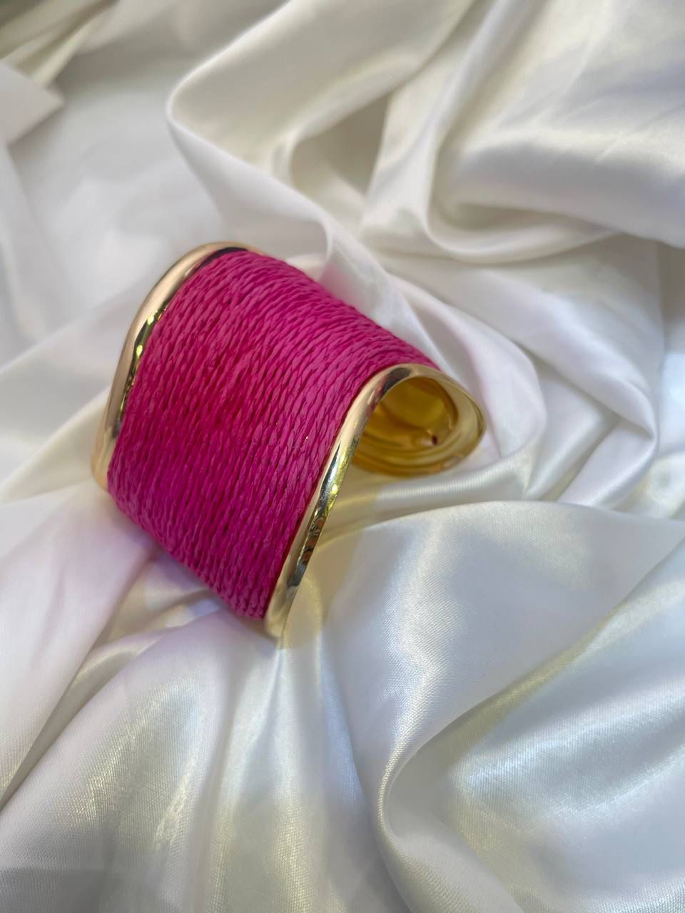 Make a vibrant statement with this striking cuff bracelet, which features a captivating woven design framed by sleek stainless steel with a golden finish. Available in both bold fuchsia and classic black, this unique piece adds a pop of color and texture to any outfit. It’s a versatile accessory perfect for elevating your everyday style or adding a chic touch to special occasions.