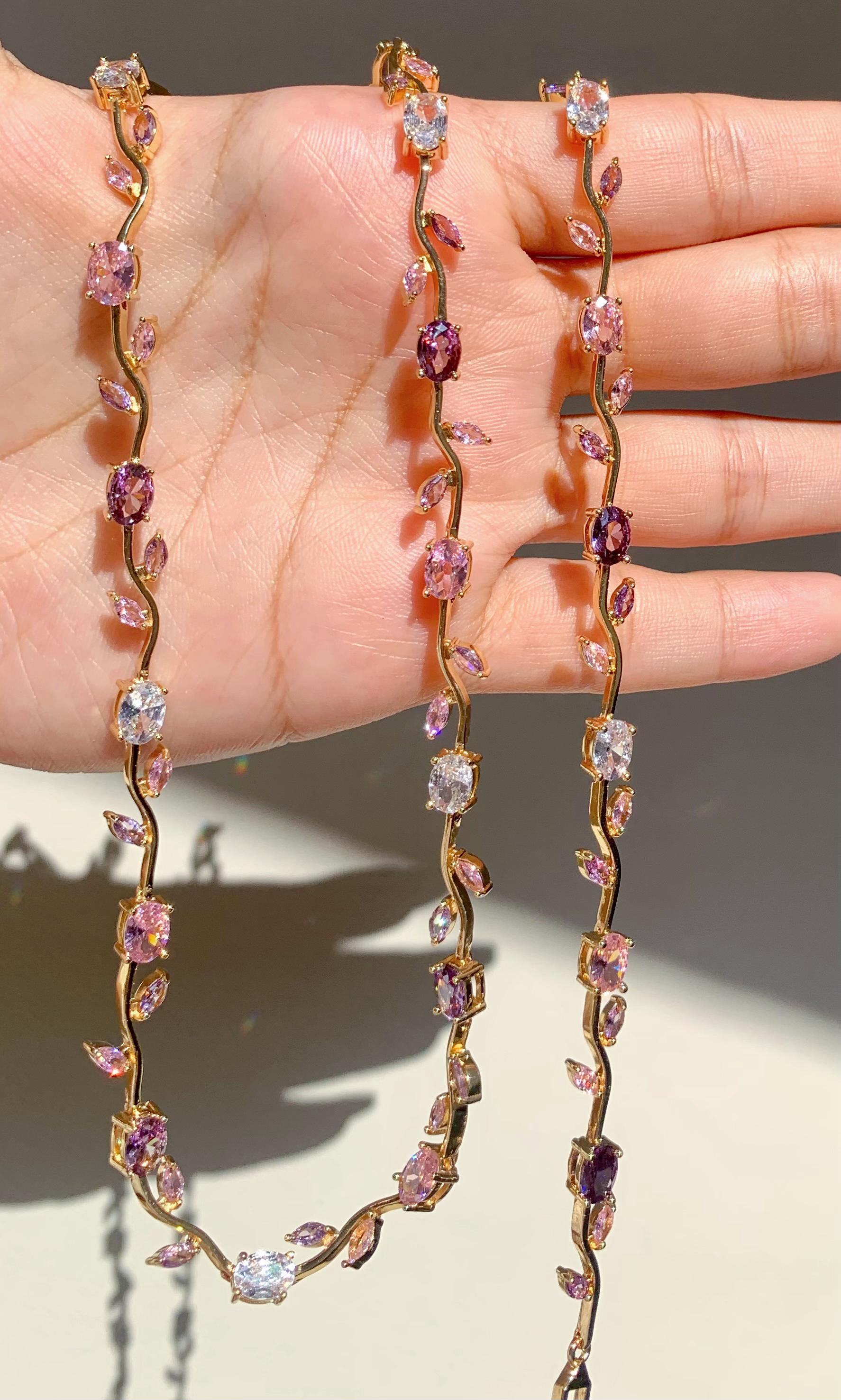 Crafted from high-quality gold-plated copper, the delicate vine-like design features striking gemstone details, creating a truly unique and graceful accessory.